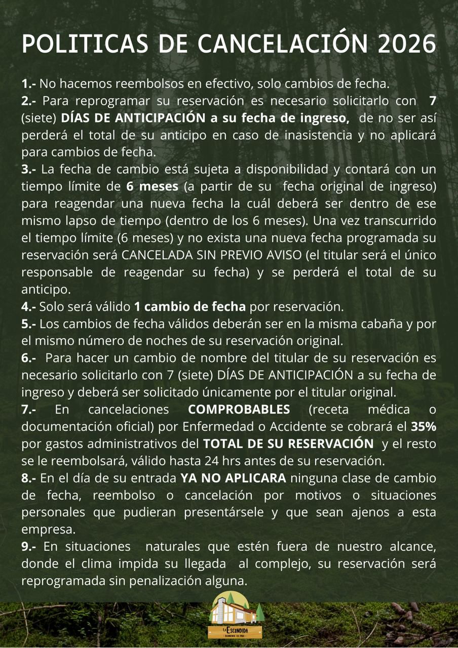 Cabañas totalmente equipadas, tanto en el área de cocina; refrigerador, parrilla de gas y equipo de cocina, como en el área de blancos; ropa de cama recién lavada y puesta el día de su entrada, suficiente para todas las personas incluidas en su reservación, en el área de baños; toallas de cuerpo y manos. Insumos como; Shampoo, jabón corporal, jabón de manos, papel higiénico, jabón de trastes, esponjita nueva para trastes.